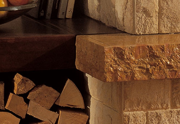 Закрытая по бокам пристенная модель, сокращенная версия. Выполнена из колотого золотистого камня, каминная плита - из желтого королевского мрамора, боковые элементы и балка - из дерева.