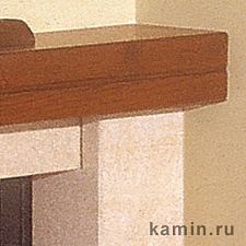 Угловая модель с вертикальными опорами, фасадом и нижними цоколями из мрамора жемчужно-розового цвета, шероховатого/под старину. Плита и вставки из красного мрамора скирос. Деревянная балка.